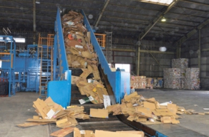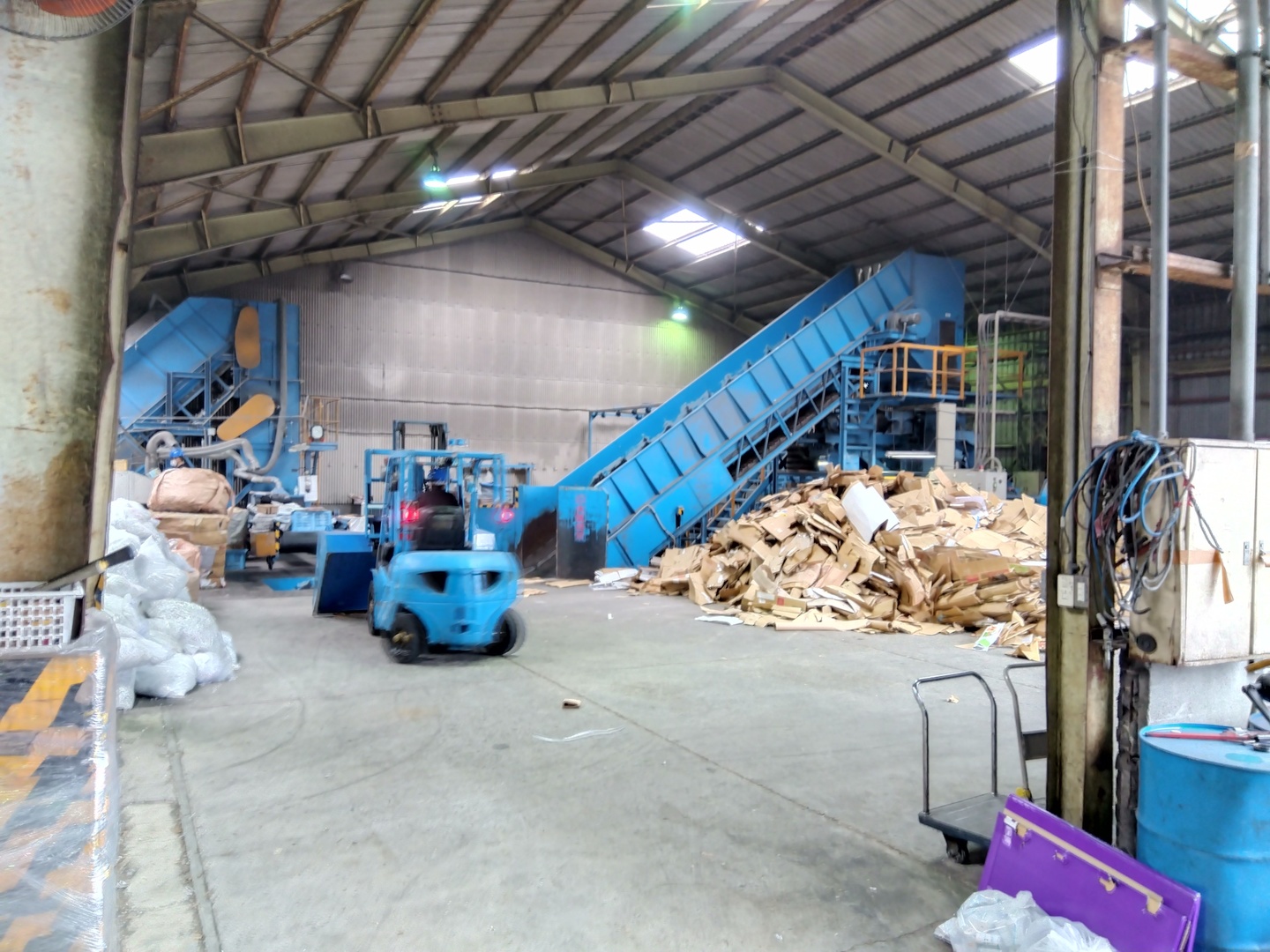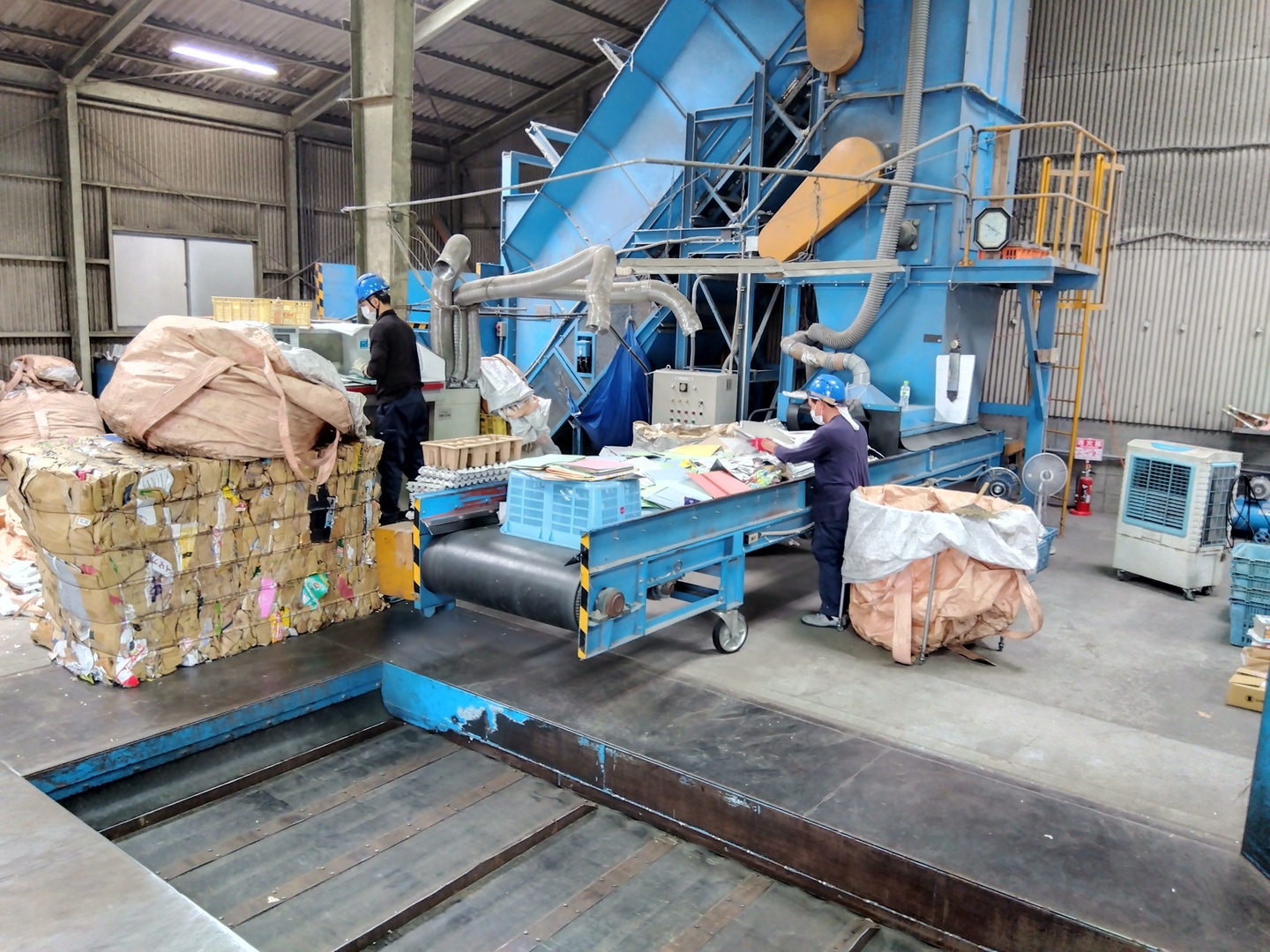 段ボール・書き損じた紙くず・新聞紙・雑誌・チラシなどは圧縮・梱包して製紙原料として→製紙工場へ