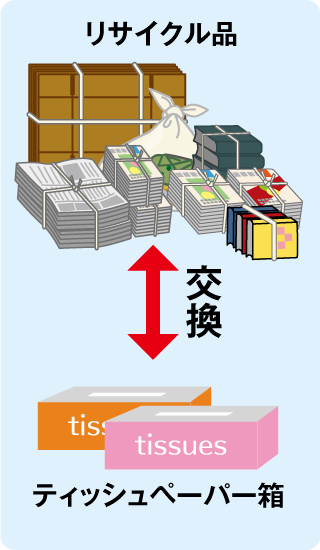 チラシ・新聞・雑誌、段ボールなど、リサイクル出来るものは、有名ブランドティッシュペーパー箱と交換します。